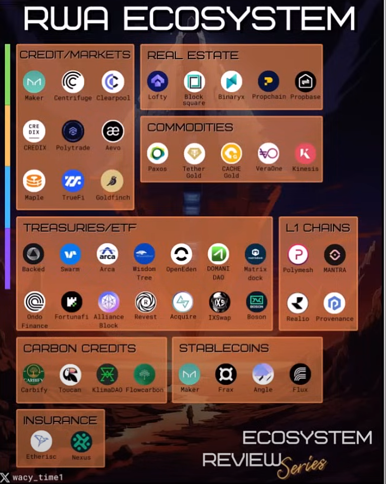 이미지에는 RWA 생태계를 크게 7가지 영역으로 구분하여 코인들을 표시하고 있습니다.
