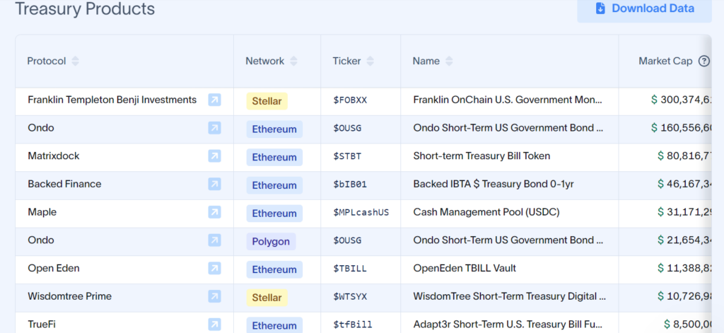 TREASURIES/ETF 영역은 국채나 ETF와 같은 금융 상품을 토큰화한 코인들을 모아놓았습니다.