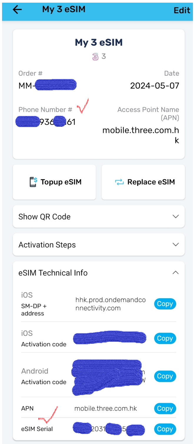 역시 마이 이심 인포에서 eSIM Technical Info의