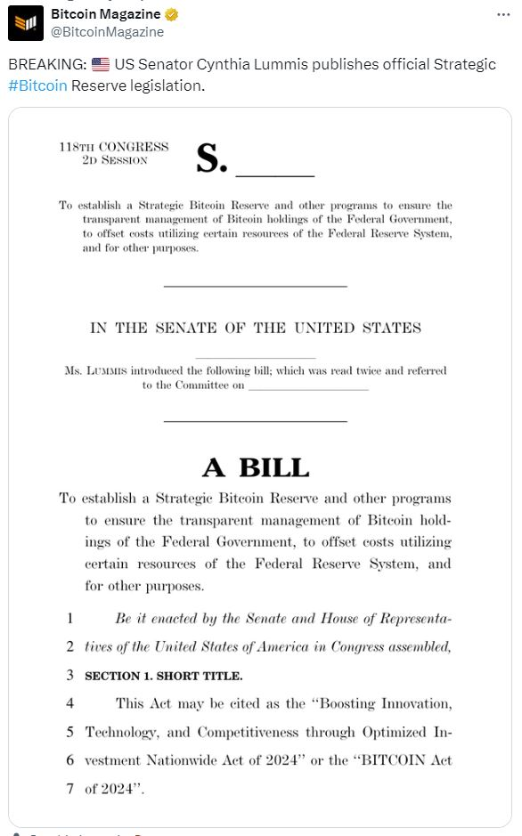 비트코인매거진 X 계정에 따르면 친암호화폐 성향의 미국 와이오밍 주 상원의원 신시아 루미스(Cynthia Lummis)가 연방준비제도(Fed·연준)가 전략적 준비 자산으로 비트코인을 보유하도록 요구하는 새로운 법안을 공식 발표했다.