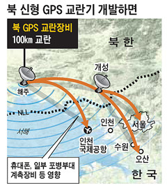 북한은 지상 송신기를 사용하여 인근 지역의 GPS 신호를 방해하는 고전력 무선 주파수 신호를 방출합니다.
