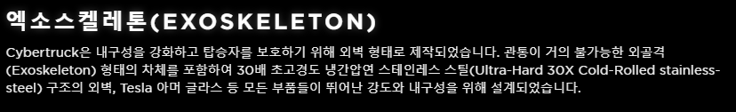 트럭의 차체는 Tesla가 방탄이라고 주장하는 초경질 30X 냉간 압연 스테인리스 스틸로 만들어졌으며 창문은 장갑 유리로 만들어졌습니다.